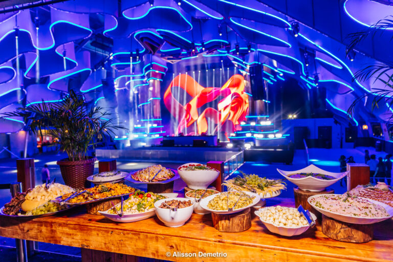 A ceia, sempre um dos pontos mais comentados das edições passadas, mantém a tradição do club de oferecer variedade e conforto. Picadinho de filé mignon na cama de aligot, escondidinho de carne seca com banana da terra, risotos, paella de frutos do mar, massas, crepes, mini hambúrgueres e mini hot dogs aparecem tanto na pista quanto na área VIP. Para quem prefere outra linha, as opções veganas são mais do que apenas um aceno simbólico: strogonoff de palmito, arroz com legumes, espaguete de pupunha com tomates frescos e manjericão e batatas rústicas com castanhas brasileiras. Nada disso é detalhe. É construção de reputação.