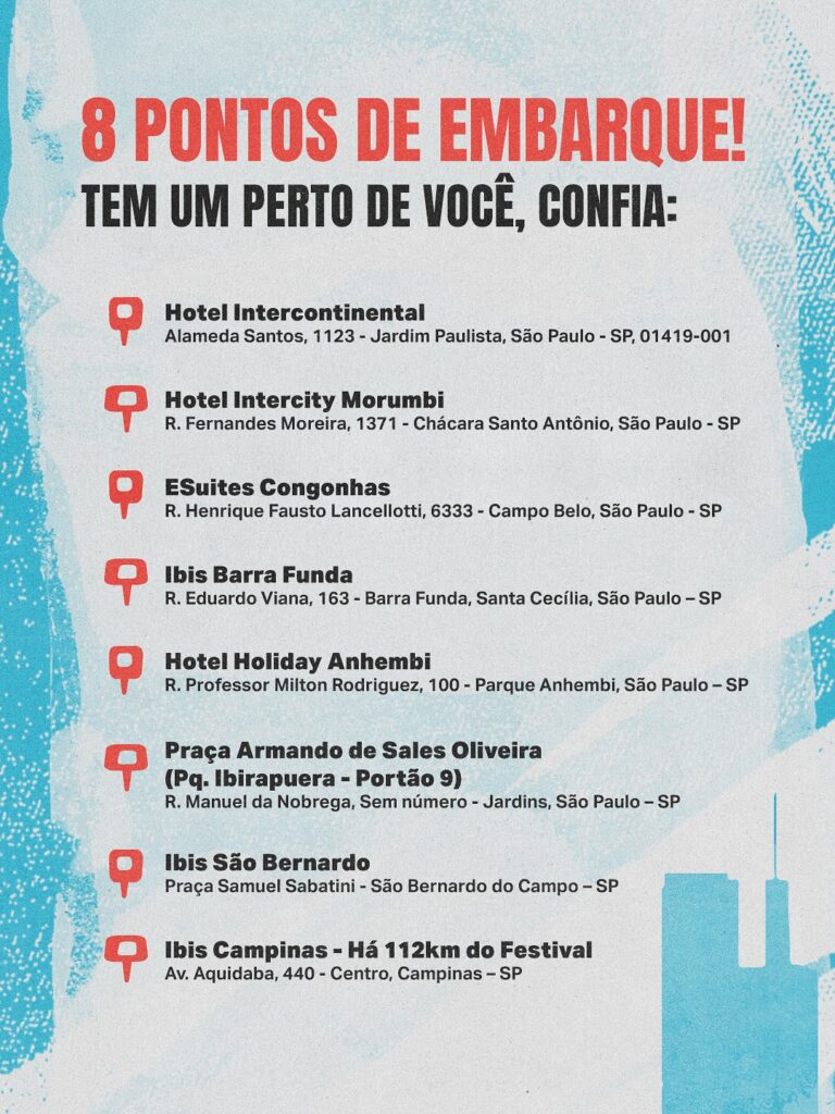 Ao todo, são 8 pontos de embarque, com diversos horários disponíveis, permitindo que os fãs escolham a melhor opção de acordo com sua programação. O trajeto é realizado em ônibus executivos climatizados, equipados com banheiros e assentos reclináveis, oferecendo mais conforto durante todo o percurso. O serviço também opera em trajeto direto, sem paradas, garantindo mais agilidade e segurança.