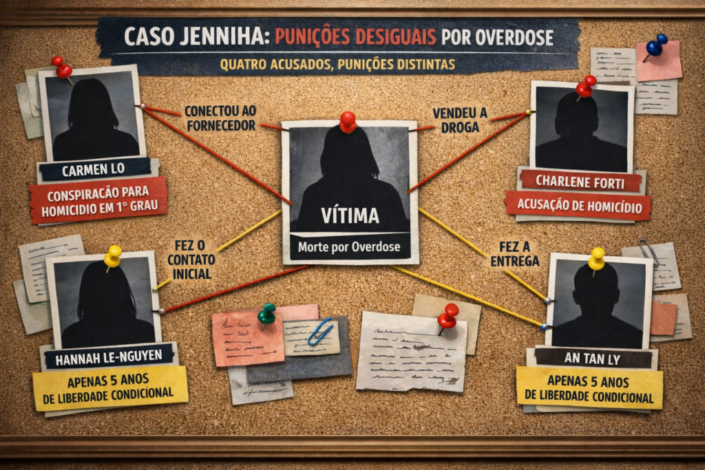 O caso de Jenniha revela algo perturbador sobre como o sistema legal aborda overdoses: quatro pessoas foram acusadas por uma morte, mas com punições completamente desiguais.
